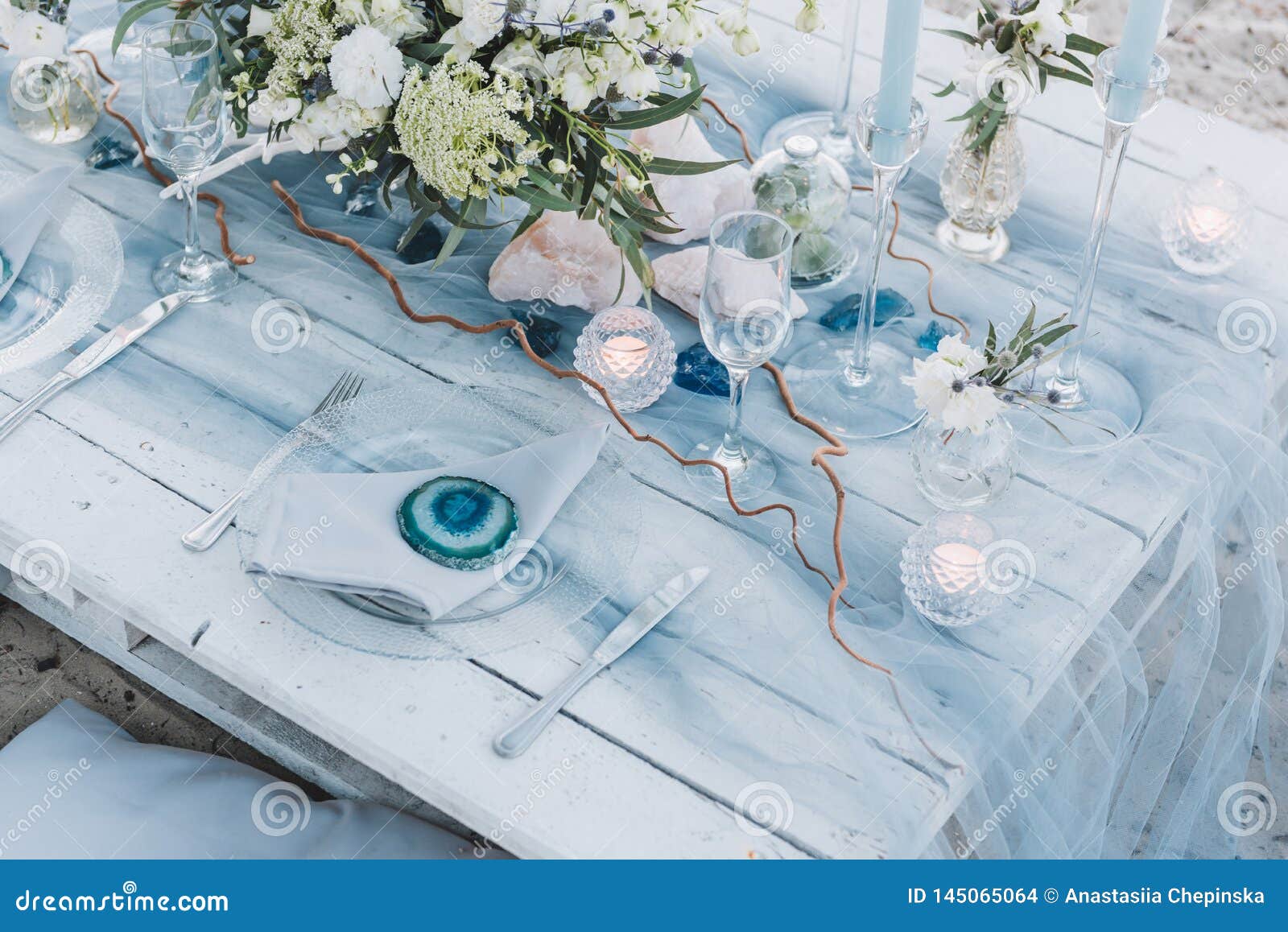 Elegant Table Setup In Blue Pastels For A Beach Wedding Stock