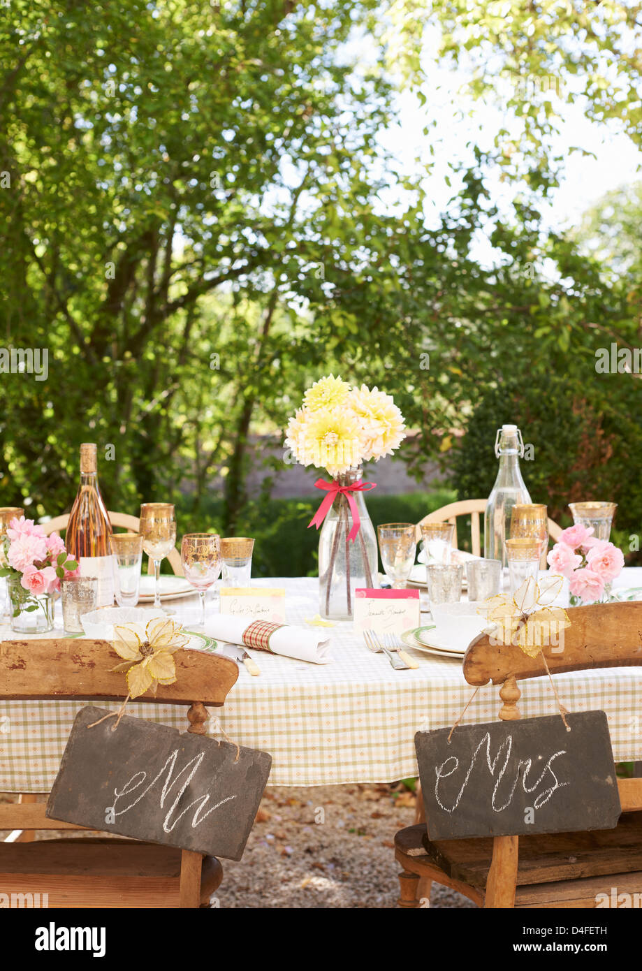 Garden Table Setting At Wedding Reception Under Sunset Sun Rays