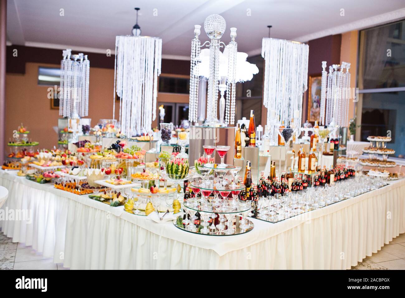 Dessert Table Of Delicious Sweets On Wedding Reception Stock Photo