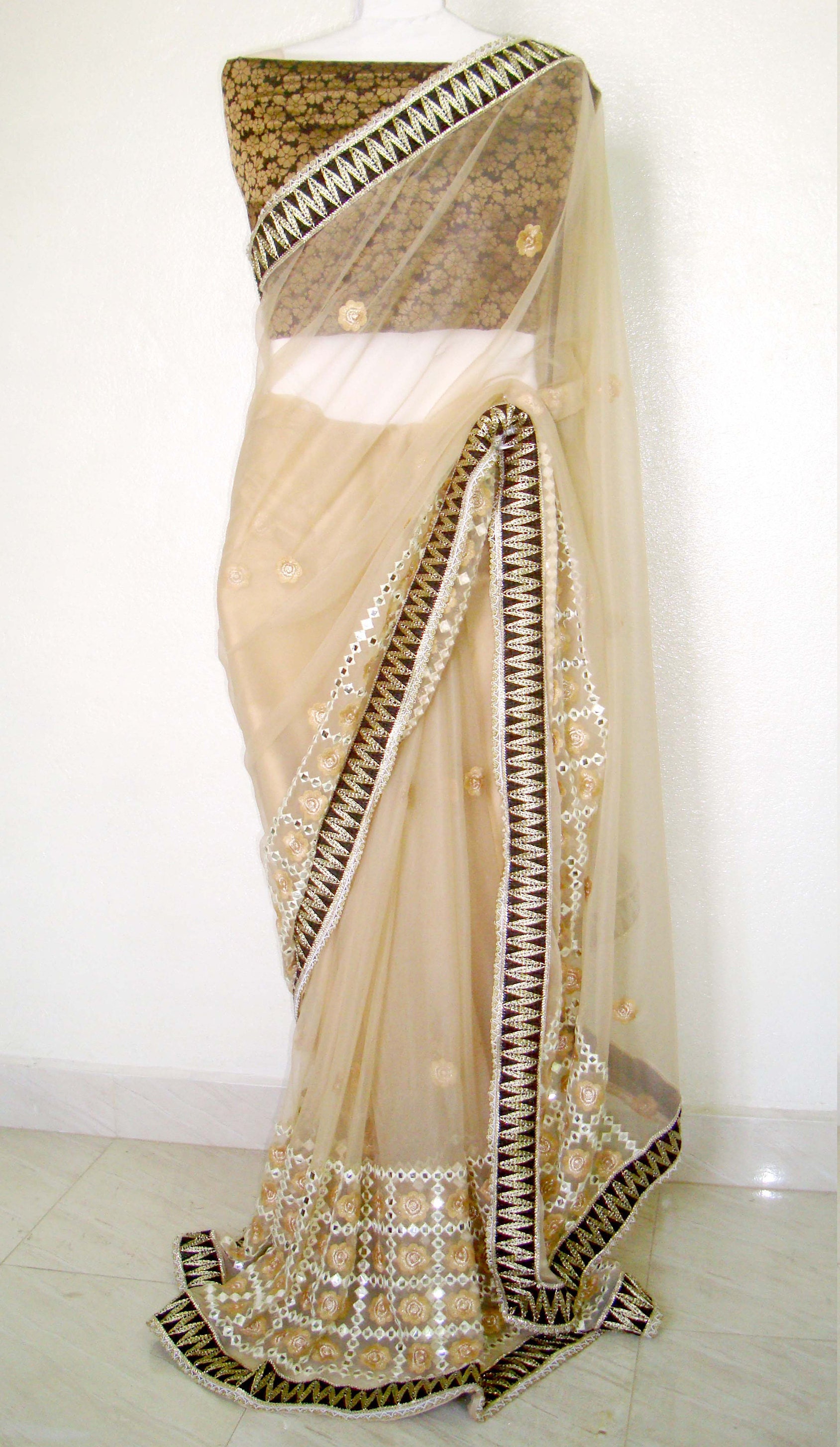 Beige Color Net Embroidery Sari Indian Bridal Saree Etsy