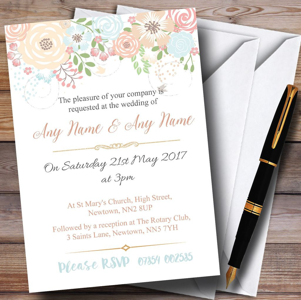 Wedding Invitation Coral Peach Blue Birds Flowers