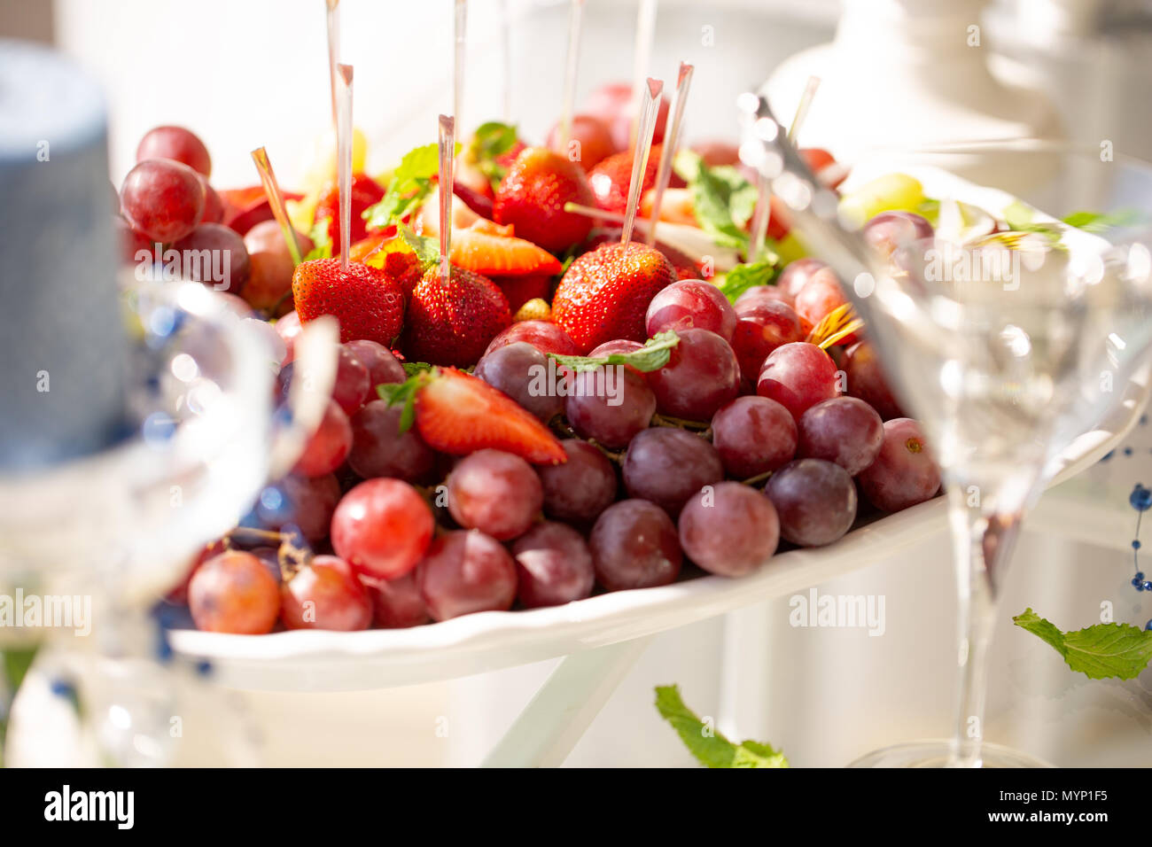Plate With Sliced Fruits And Berries On Servered Buffet Table At