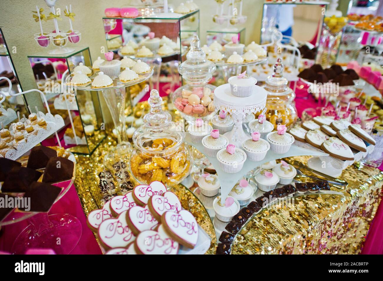 Dessert Table Of Delicious Sweets On Wedding Reception Stock Photo